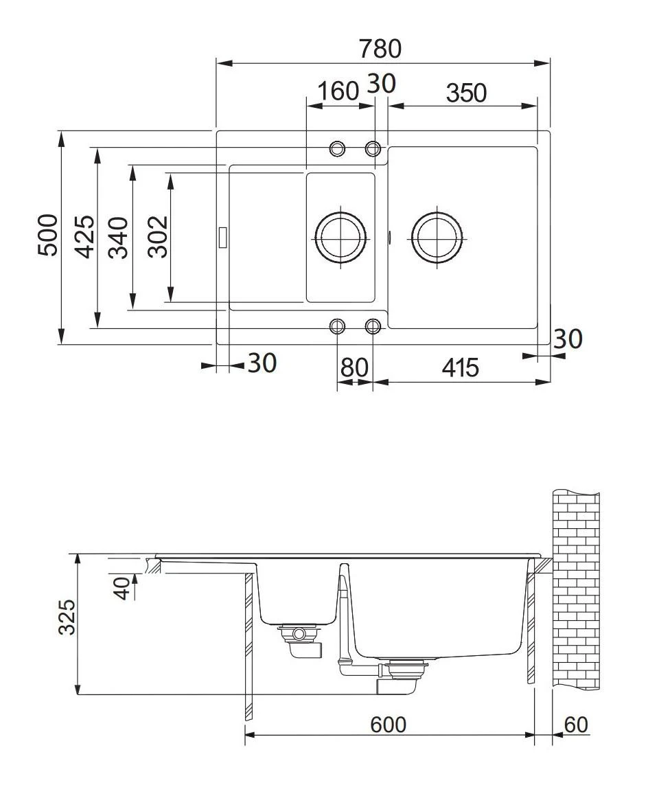 Abmessungen des kleineren Spülbeckens: 160 mm